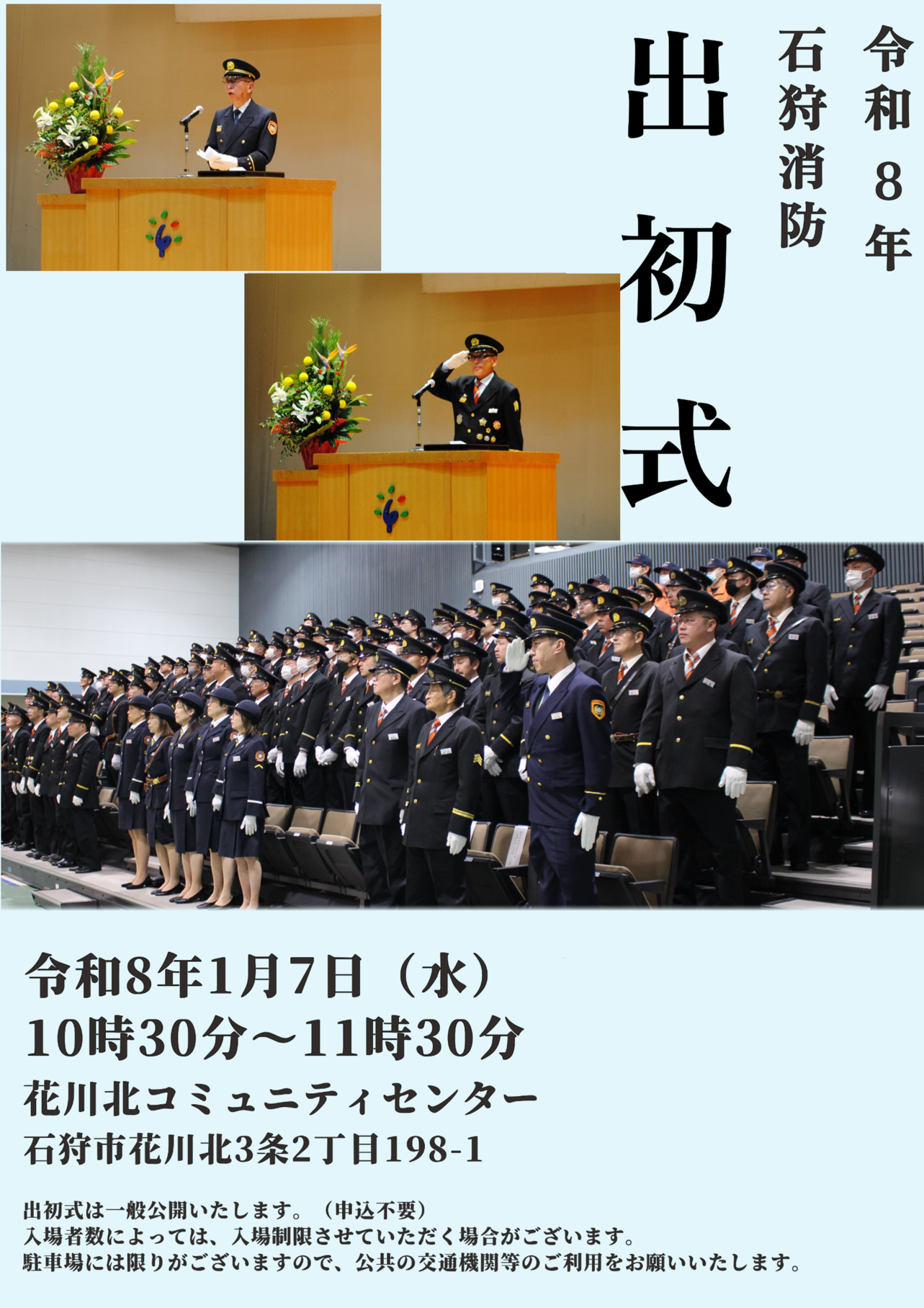 令和8年石狩消防出初式の開催について 石狩 お問い合わせ先 石狩消防署 総務課 〒061-3211 北海道石狩市花川北1条1丁目2番地3 TEL:0133-74-7112 FAX:0133-74-9814