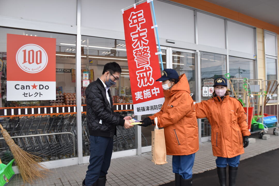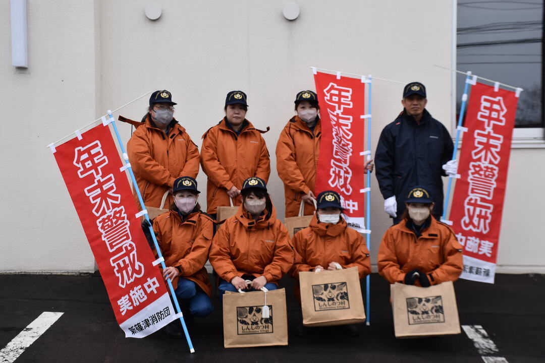 年末における火災の多発期を迎えるに当たり、地域の火災予防を主眼として12月24日~12月28日までの間、年末警戒を実施しました。期間中に防災行政無線、消防車両での火災予防広報や女性消防団による年末街頭啓発をホクレンショップ新しのつ店前、新篠津村農業協同組合前、ホクレン新篠津SS前にて実施し、火災予防啓発品、防火パンフレットを配布しました。